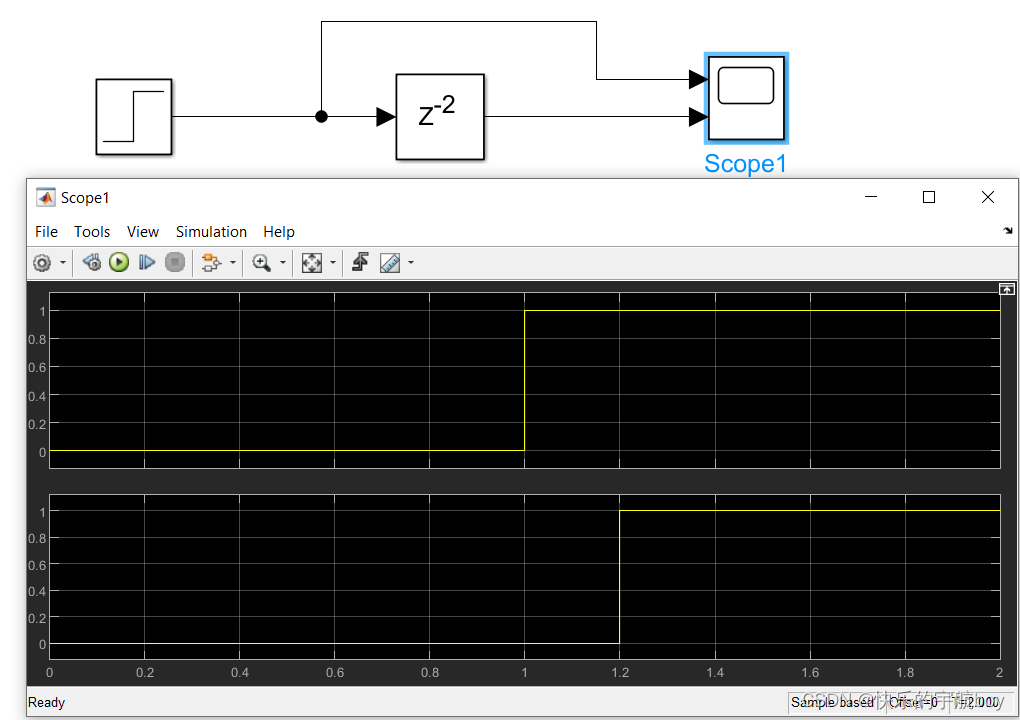 如下的例子,输入信号是一个阶跃信号,信号值在1s时跳变为1,delay模块的Delay Length为2,模型的step-size为0.1s,因此输出相比于输入应延迟0.2s,通过scope观测到的结果符合这个规律。