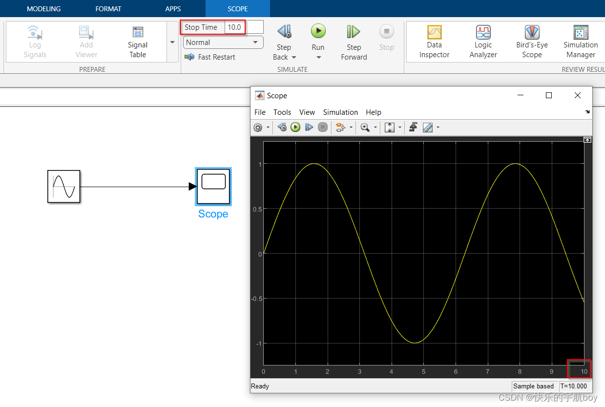 如下设置模型的仿真时间为10s,scope中显示的最大时间也是10s