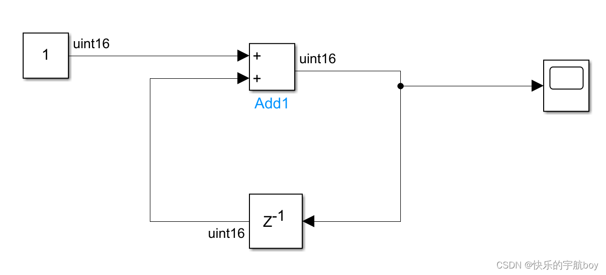delay模块的一个常用功能,是用来搭建累加计数器,如下模型可实现每个仿真步长输出的数据加1的效果。