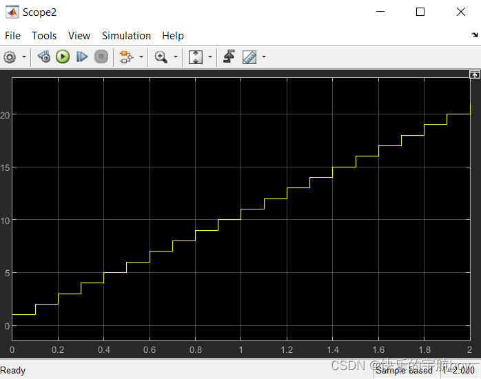 delay模块的输出,即上一次的加法器输出值,在本次运行,加1后,再输出,并作为delay模块的输入,因此,模型每次运行,都是在上一次的累加和的基础上再加1并输出。scope观测的结果如下: