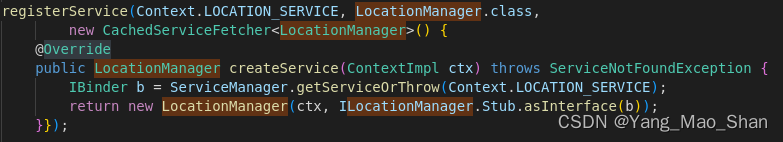 在静态代码块中,就是这里将 Context.LOCATION_SERVICE 将 LocationManager 和 LocationManagerService 绑定起来,API 接口 LocationManager 中就是通过这里的注册拿到 LocationManagerService 服务的。