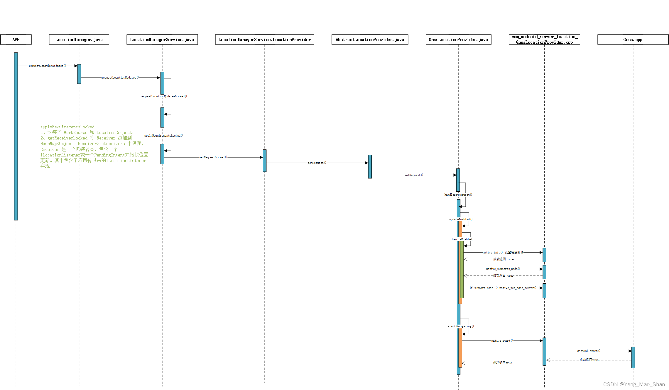 先来一张 requestLocationUpdates() 上层发起位置请求函数的序列图。服务端接收到应用端传过来的位置请求,会封装 WorkSource 和 LocationRequest;并且将 LocationListener 保存到 Receiver 包装类中,存在 HashMap<Object, Receiver> mReceiver 中。 然后将请求通过 JNI,下发到底层。