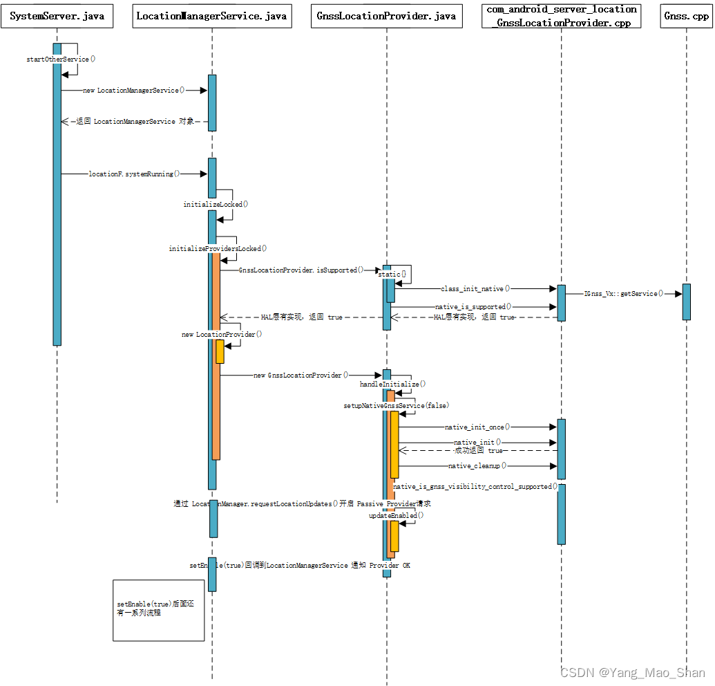 GnssLocationProvider 初始化的入口是从 LocationManagerService 中初始化 Provider 开始的。调用 GnssLocationProvider.isSupported() 去加载 GnssLocationProvider 类,此时会加载 GnssLocationProvider 中静态代码块的内容,去做 JNI 相关初始化的工作。