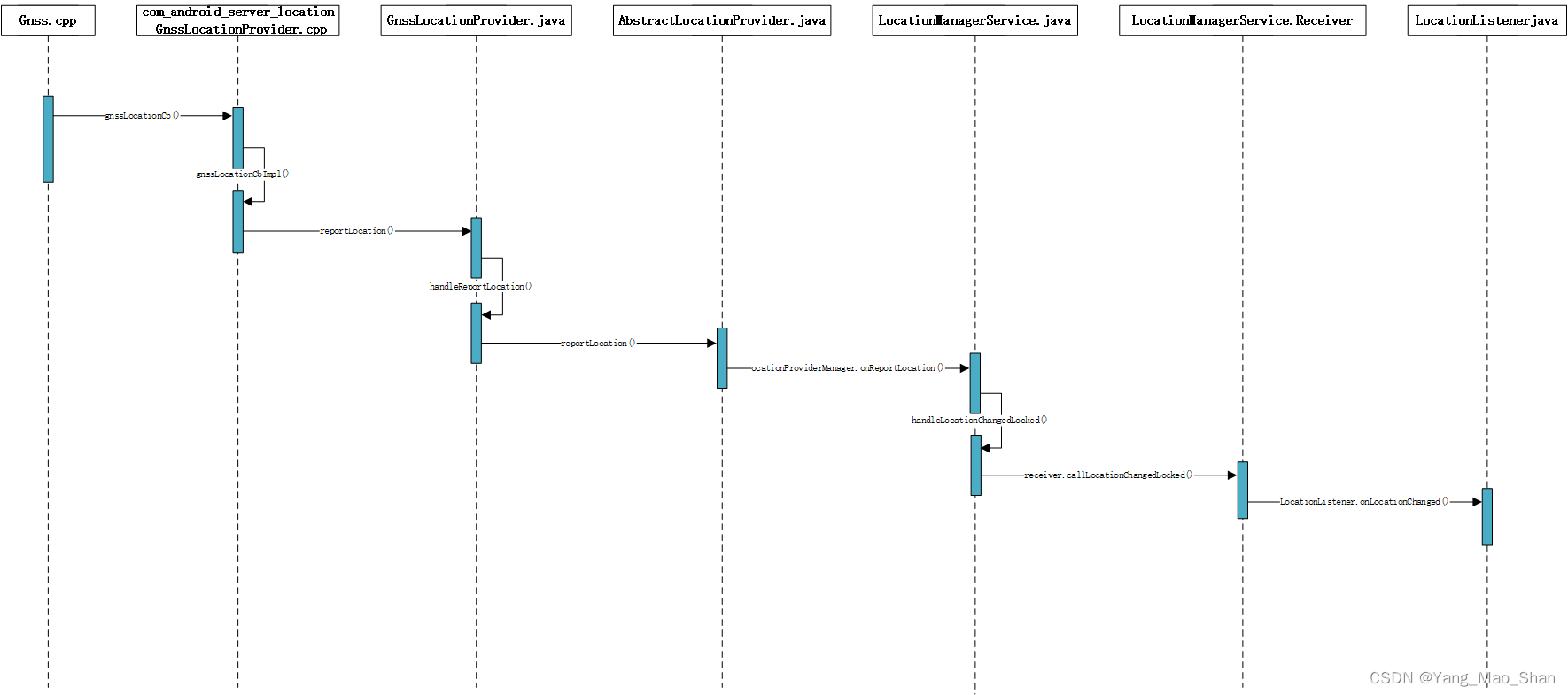 * LocationProviderManager 是在 LocationManagerService 传入的 LocationProvider 对象,主要的作用就是调用到 LocationManagerService 中的 LocationProvider 的 onReportLocation() 函数上报位置信息;最终是调用到 LocationProviderManager.LocationProvider 中去,中间从 AbstractLocationProvider 过渡一次,再由 AbstractLocationProvider 中保存的 LocationProvider 实现类,调用到 LocationManagerService 中去。