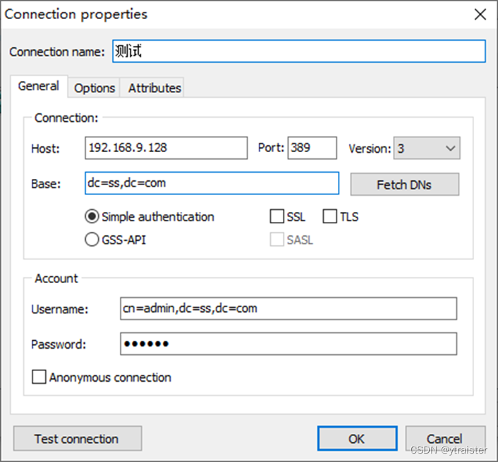 - 用户名:cn=admin,dc=ss,dc=com
