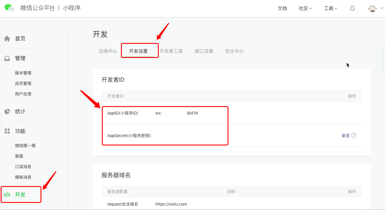 登录自己的小程序账号,点击开发–开发设置就能看到appId、appSecret信息