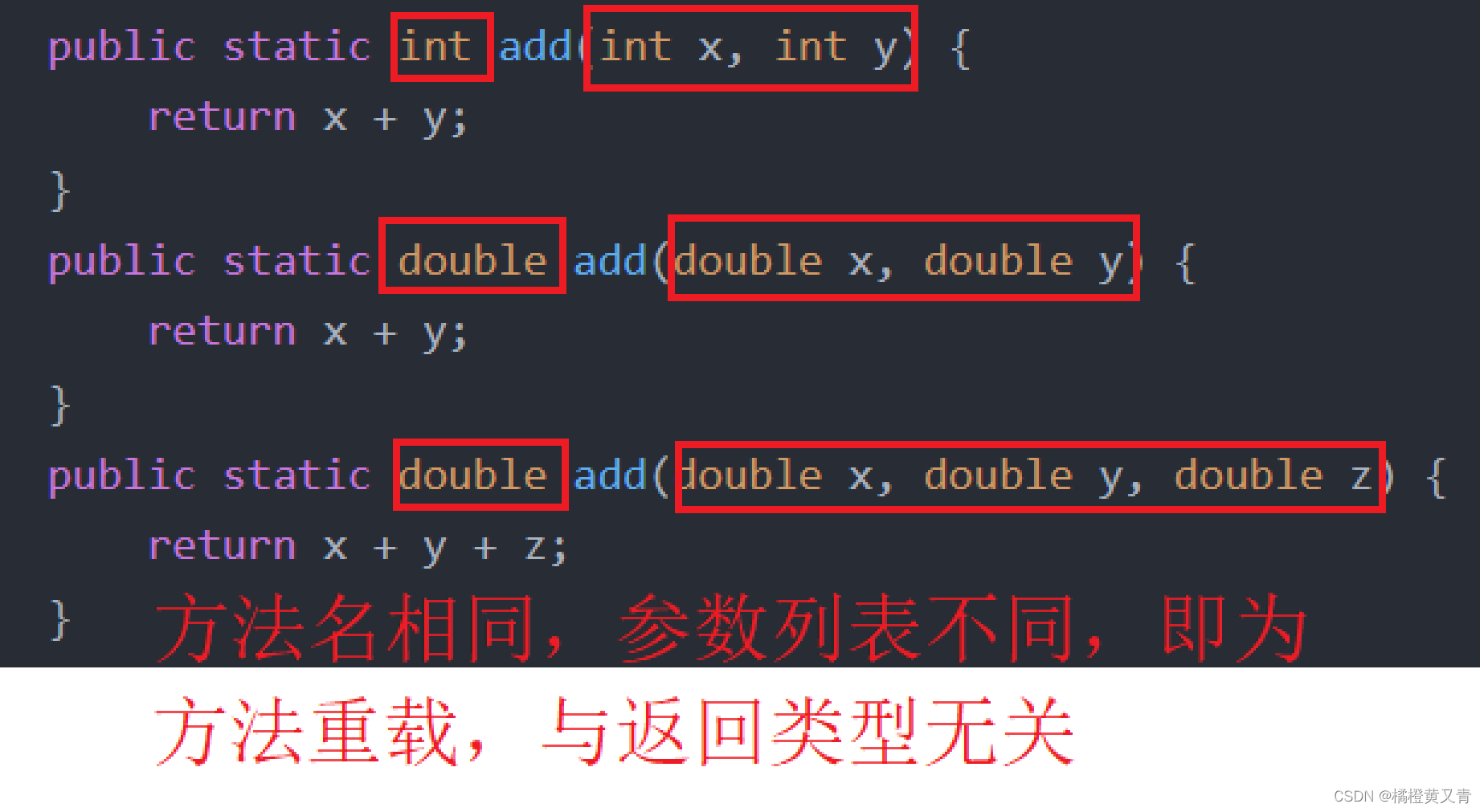 // 注意:两个方法如果仅仅只是因为返回值类型不同,是不能构成重载的。