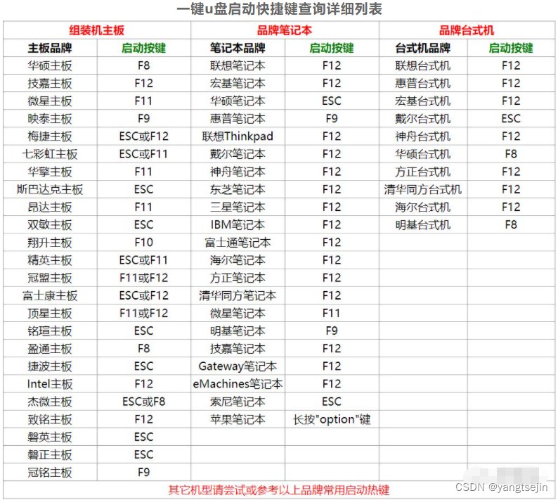 找到自己电脑型号对应的“启动项快捷键”,如下图所示,不一定准确,以具体机型为准