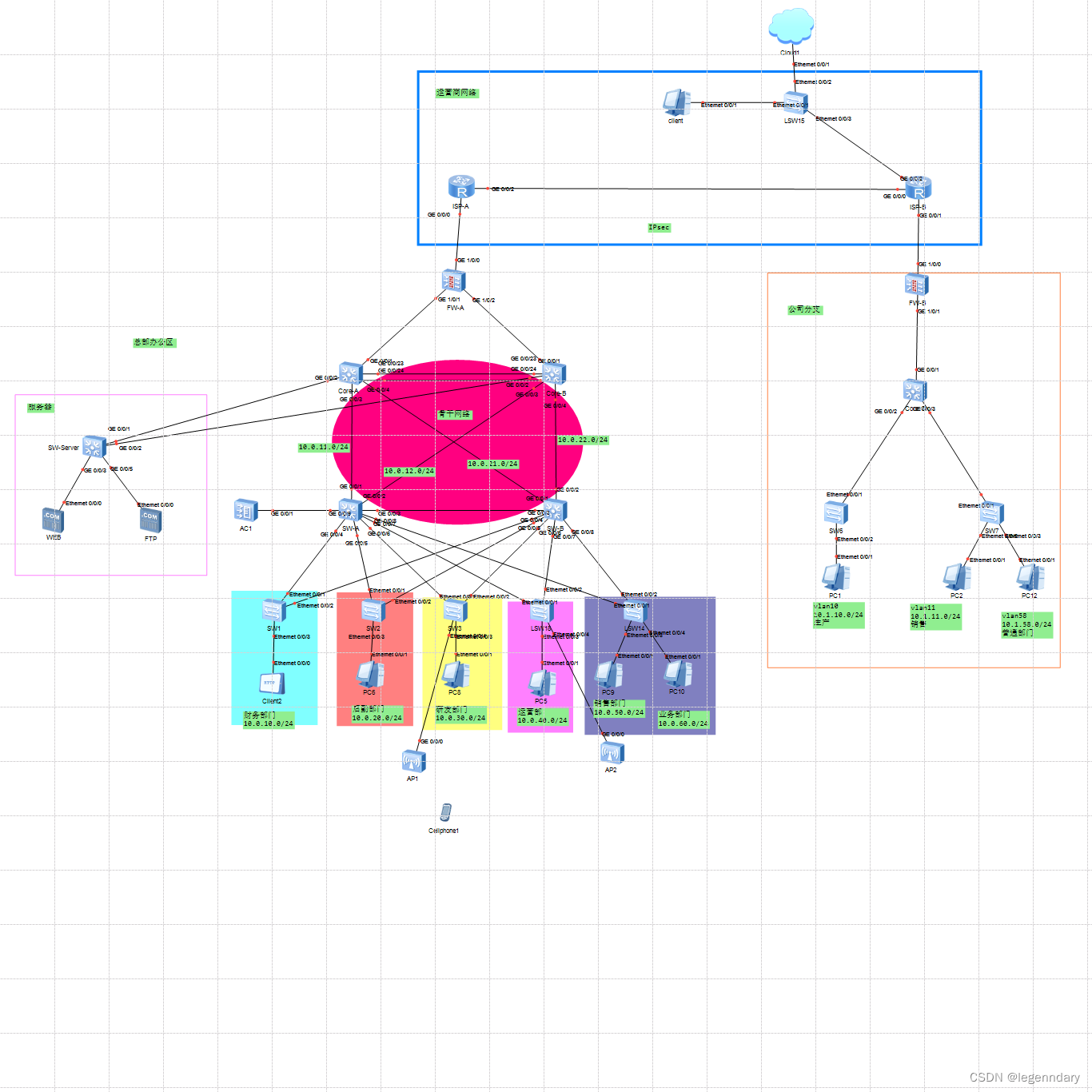 文章简介:本文做了一个中型企业无线网络的设计,课题重点突出无线网络和高安全性,除了基础的功能要通,还需要实现无线AP,防火墙功能,VLAN技术,ACL访问控制实现过滤,生成树协议,负载分担,NAT技术实现私有网络IP地址转换为公有网络IP地址,无线技术,加密技术。GRE over IPSec VPN技术,部门的话设置为可以按楼层划分,总裁办,IT部门,市场发展部,行政部,财务部,人力资源部,工程技