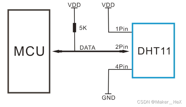 需要注意的是,上图所购买的DHT11传感器是自带电阻的,如果买的是没有电阻的传感器(如下图所示),就需要在DHT11传感器的信号线(DATA)上,需要加入一个4.7K ~ 10K欧姆的上拉电阻。这个电阻的作用是将传感器的信号线拉高,以确保在没有数据传输时,信号线的电平为高电平。如果不加上拉电阻,传感器的信号线可能会漂移,导致数据传输错误。(注:3号NC引脚悬空即可,什么都不接)
