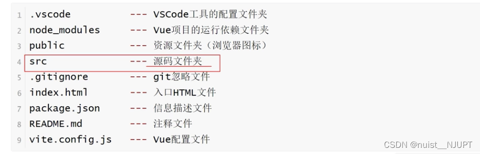 vue项目的目录结构如下所示,我们最关心的是src目录,后期的代码都是写在src目录下,当然其他目录结构用到的时候继续解释吧。