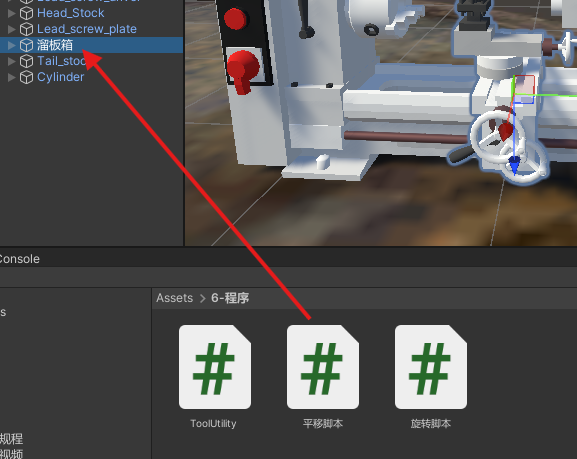 和2. 中的方法一样,我们可以在机床上,找到溜板箱的整个装配体,加载平移脚本,并在Inspector上修改必要参数,实现溜板箱在行程范围内的移动。