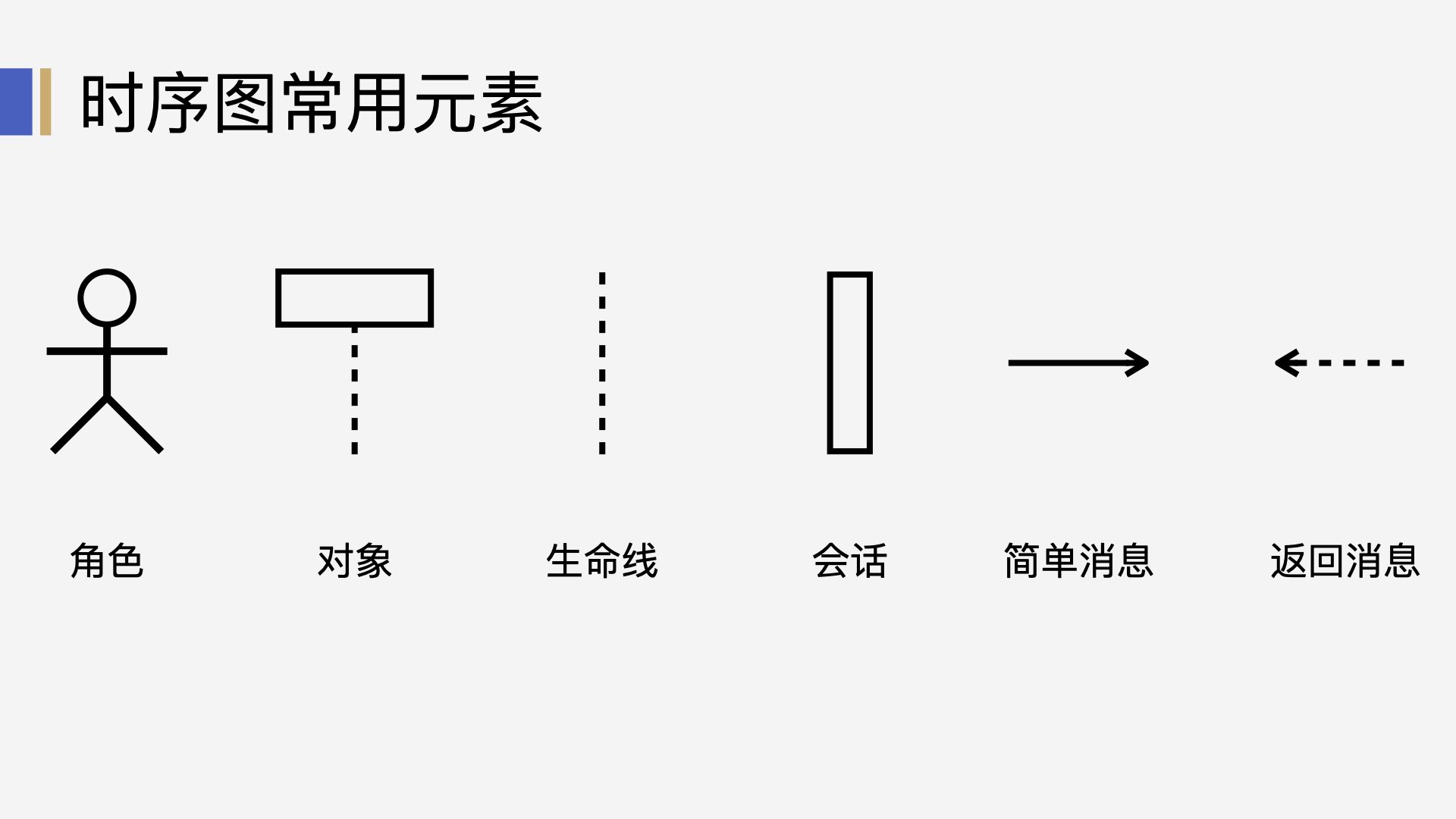 时序图的常用元素很简单,分别有:对象(角色)、生命线、会话、消息(简单消息、返回消息)。