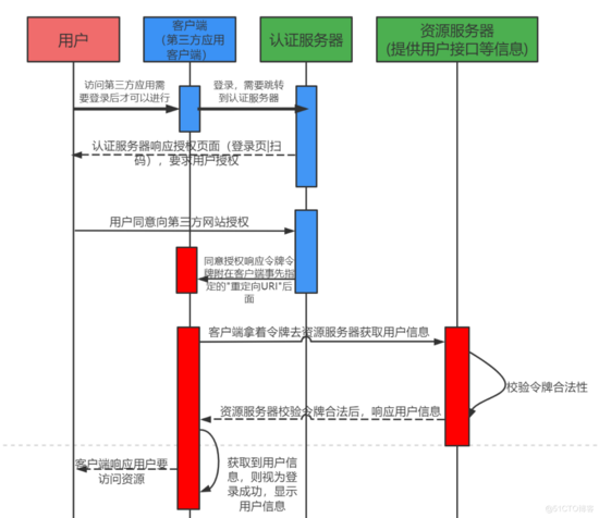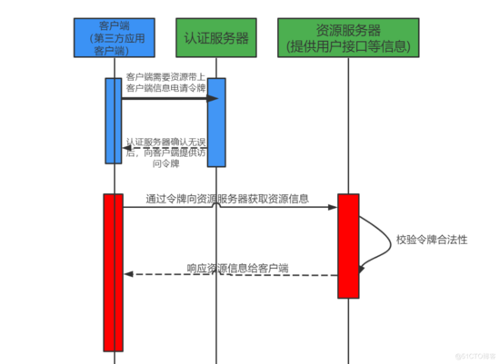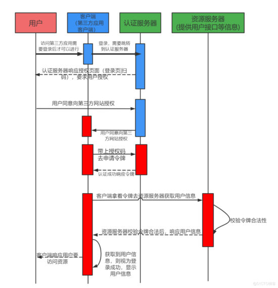 - 资源服务器(Resource Server) :存储用户的资源,验证令牌有效性。比如:微信资源服务器存储了微信用户信息,淘宝资源服务器存储了淘宝的用户信息。