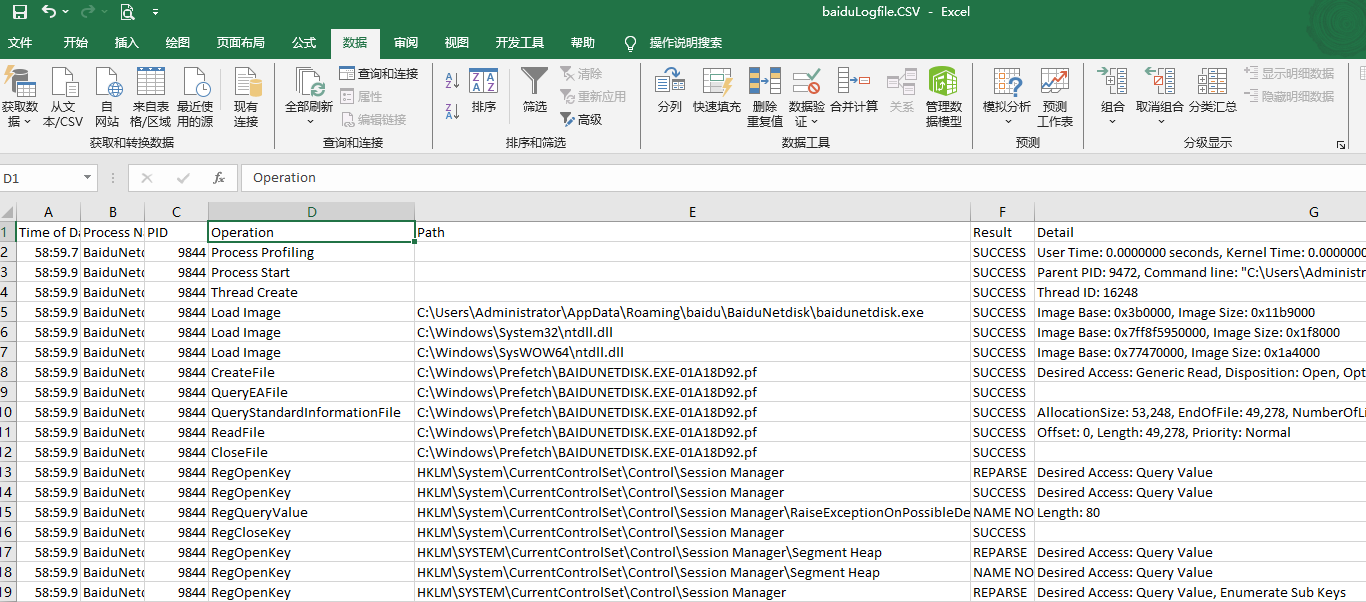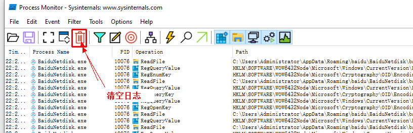 现在确保启用了监控 清空日志 启动百度网盘 这样就能录制到 百度网盘 软件 从开启 到运行 做了啥