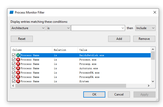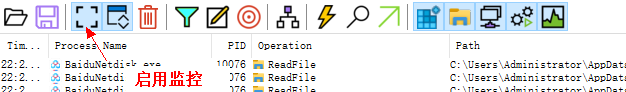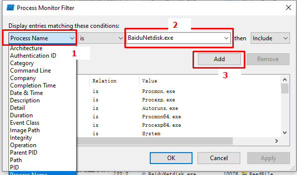 用 ProcessMonitor 软件 过滤规则 把 百度网盘 软件 进程 加入监控,