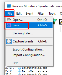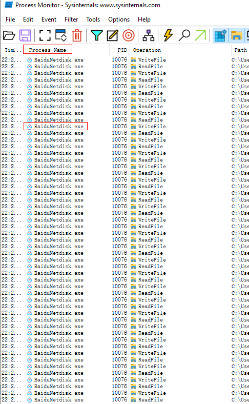 百度网盘软件 在 ProcessMonitor 中 进程的名称 process Name 为 BaiduNetdisk.exe