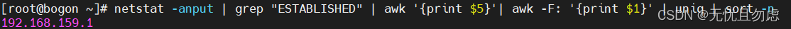 过滤已建立连接的ESTABLISHED,Foreign Address,使用uniq去重和sort排序