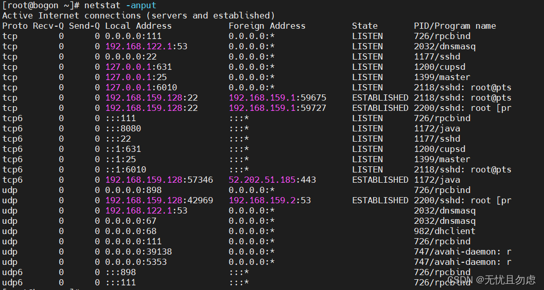netstat -anput | grep "ESTABLISHED" | awk '{print $5}'| awk -F: '{print $1}' | uniq | sort -n netstat -anput | grep "SYN" | awk '{print $5}'| awk -F: '{print $1}' | uniq | sort -n