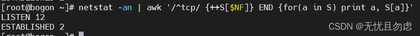 netstat -an | awk '/^tcp/ {++S[$NF]} END {for(a in S) print a, S[a]}'