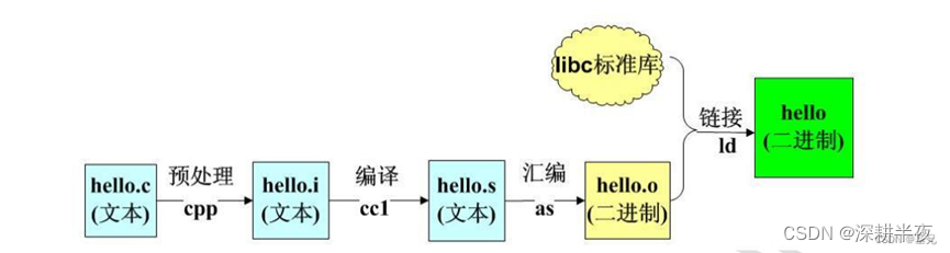 (2)编译:编译器将文本文件hello.i翻译成hello.s,包含相应的汇编语言程序。
