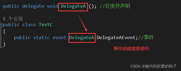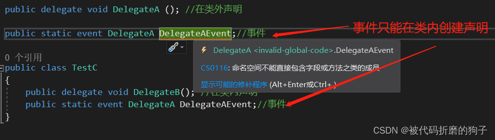 3.委托可以在任何类中或类外声明,但是事件只能在类中声明,如下: