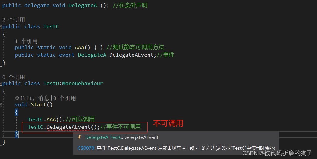 4.事件只能在当前声明的类中使用,无论将事件设置成public还是static其他类都无法调用