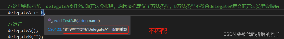 //这里错误示范 delegateA委托添加B方法会报错,原因委托定义了方法类型,B方法类型不符合delegateA定义的方法类型会报错