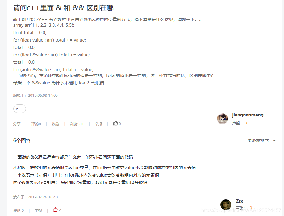假设上面两个函数是你自定义的容器类里的插入元素函数,第一个pushBack的参数类型后有一个 & ,代表传参只能传左值;第二个pushBack是 && ,是C++一个新特性,代表只能对右值取引用。 举个例子: