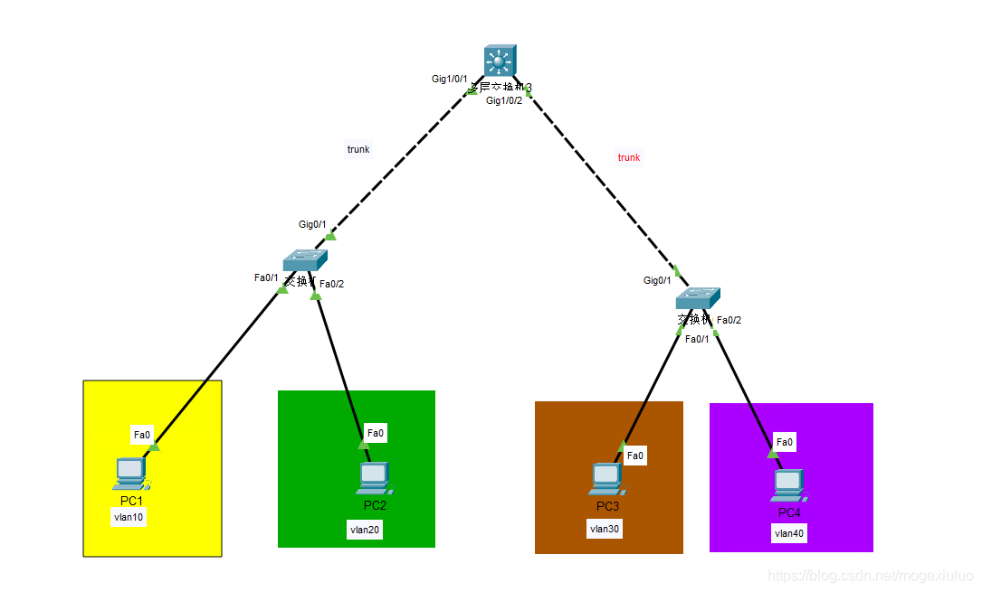 三层交换机配置:Switch>enableSwitch#configure terminalSwitch(config)#vlan 10Switch(config-vlan)#vlan 20Switch(config-vlan)#vlan 30Switch(config-vlan)#vlan 40Switch(config-vlan)#exitSwitch(config)#int vlan