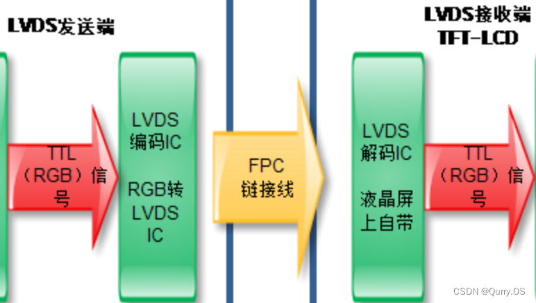有些主控芯片是不支持输出LVDS信号的,那么此时就需要用到信号转换芯片,把主控输出的TTL信号通过转换IC输出LVDS信号到排线中,一般TFT-LCD是只支持TTL信号的,所以LVDS到接收端时会通过LVDS解码IC把LVDS信号解码成TTL信号,最终输出到屏幕。