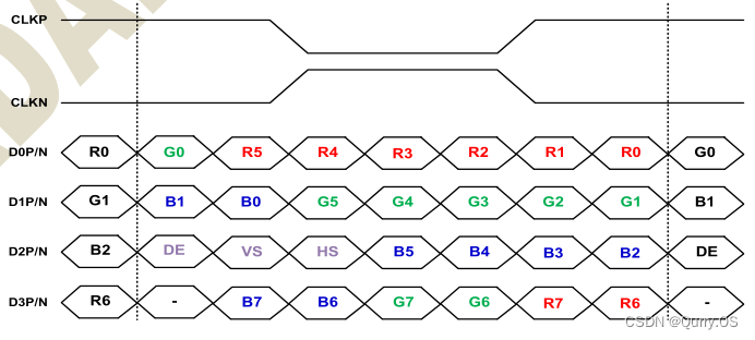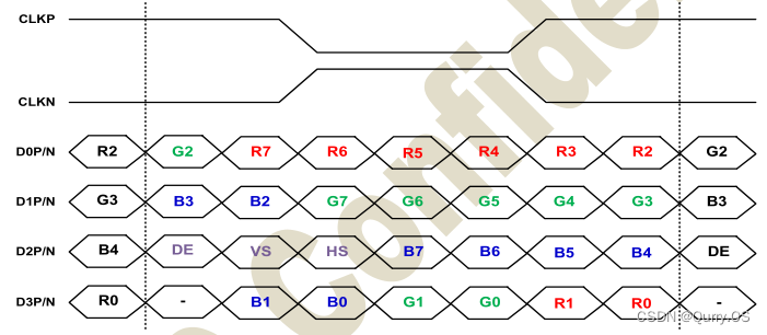 另外我们需要知道的点是,时钟通道只传输时钟信号,而数据通道传输RGB数据、使能信号、行同步信号和场同步信号,每个数据通道在一个时钟周期内只传输7bit的数据,这是固定不变的,这里划重点。