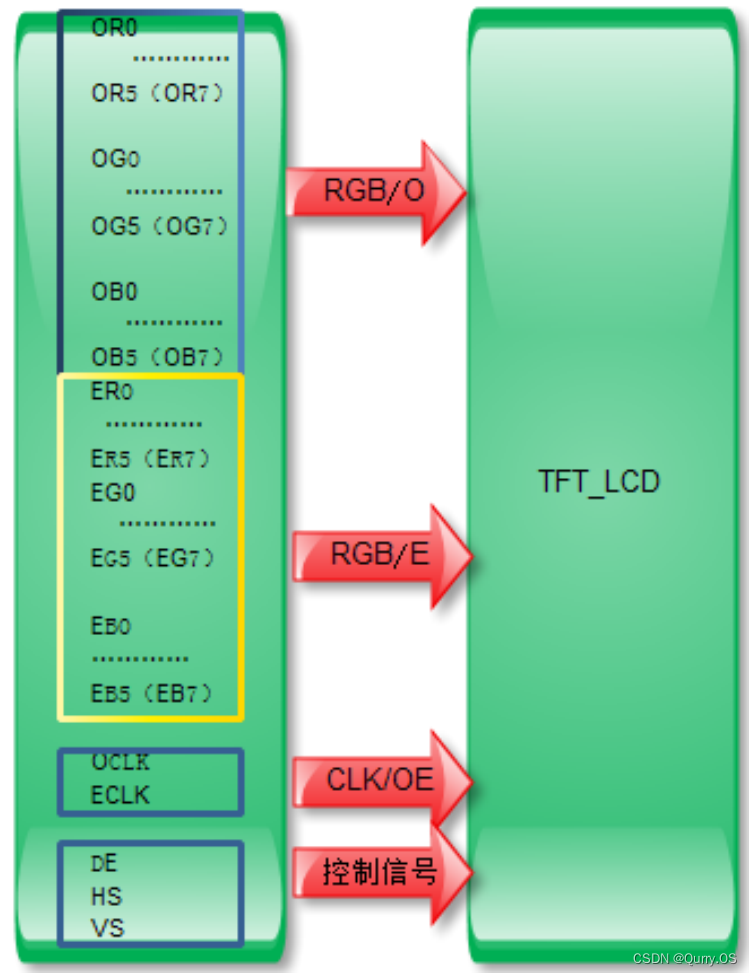 它有单通道和双通道之分,双通道就是两组 RGB 数据,分为奇通道、偶通道,时钟有的也分为 OCLK/ECLK。