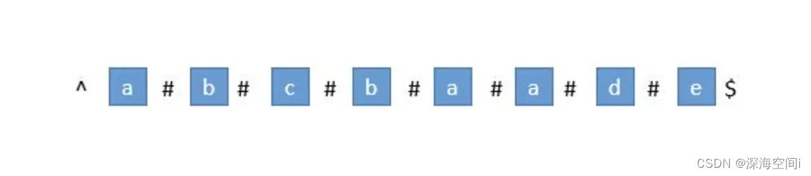 1.首先我们解决下奇数和偶数的问题,在每个字符间插入"#",并且为了使得扩展的过程中,到边界后自动结束,在两端分别插入 "^" 和 "$",两个不可能在字符串中出现的字符,这样中心扩展的时候,判断两端字符是否相等的时候,如果到了边界就一定会不相等,从而出了循环。经过处理,字符串的长度永远都是奇数了。可以得到下面的字符串