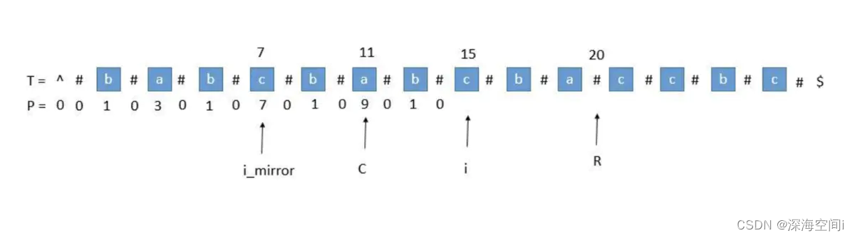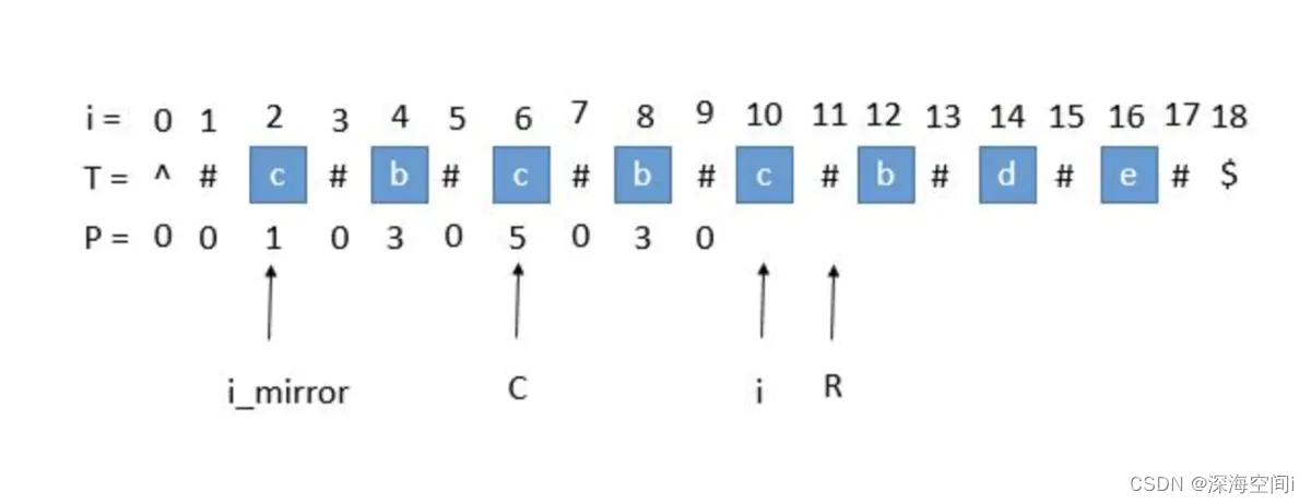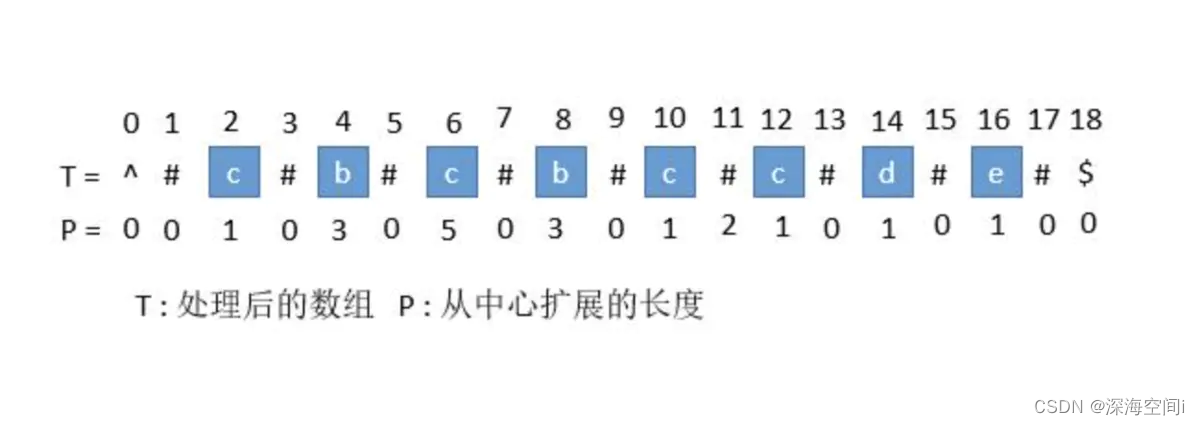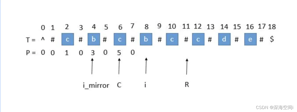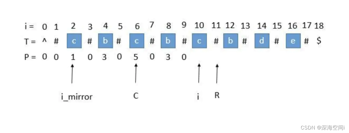 - 由图中可以发现P[i]表示的就是原字符串的回文长度,例如我们在图中下标为6位置可以发现 P[i] = 5 ,所以它是从左边扩展 5 个字符,相应的右边也是扩展 5 个字符,也就是 "#c#b#c#b#c#", 我们去除所有#号后得到cbcbc正好就是P[i]大小