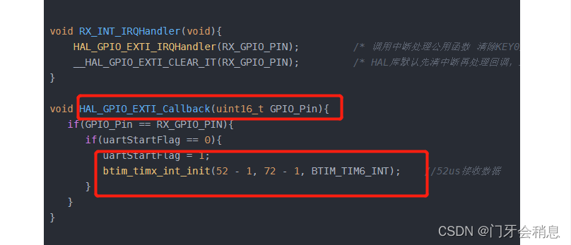 __HAL_GPIO_EXTI_CLEAR_IT(RX_GPIO_PIN); /* HAL库默认先清中断再处理回调,退出时再清一次中断,避免按键抖动误触发 */