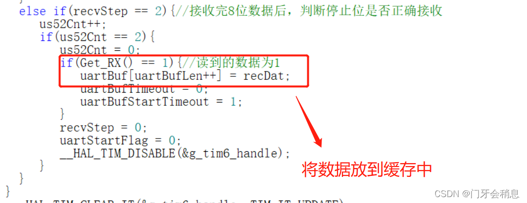 4:打开52us定时器之后,通过us52Cnt标志位记录到2之后,代表一个高低电平的持续时间达到了104us,即可以判断一个位是高电平还是低电平。之后就是根据recvStep这个标志位来区分判断起始位、数据位、停止位的过程。