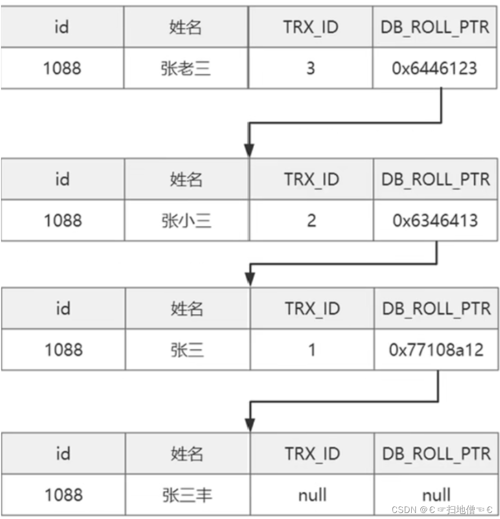 每个数据行都有一个版本链,包含了该数据行的所有历史版本。每次更新操作(如INSERT、UPDATE、DELETE)都会生成一个新的数据版本,而不是覆盖旧版本。这些版本按照时间顺序连接在一起,形成版本链。