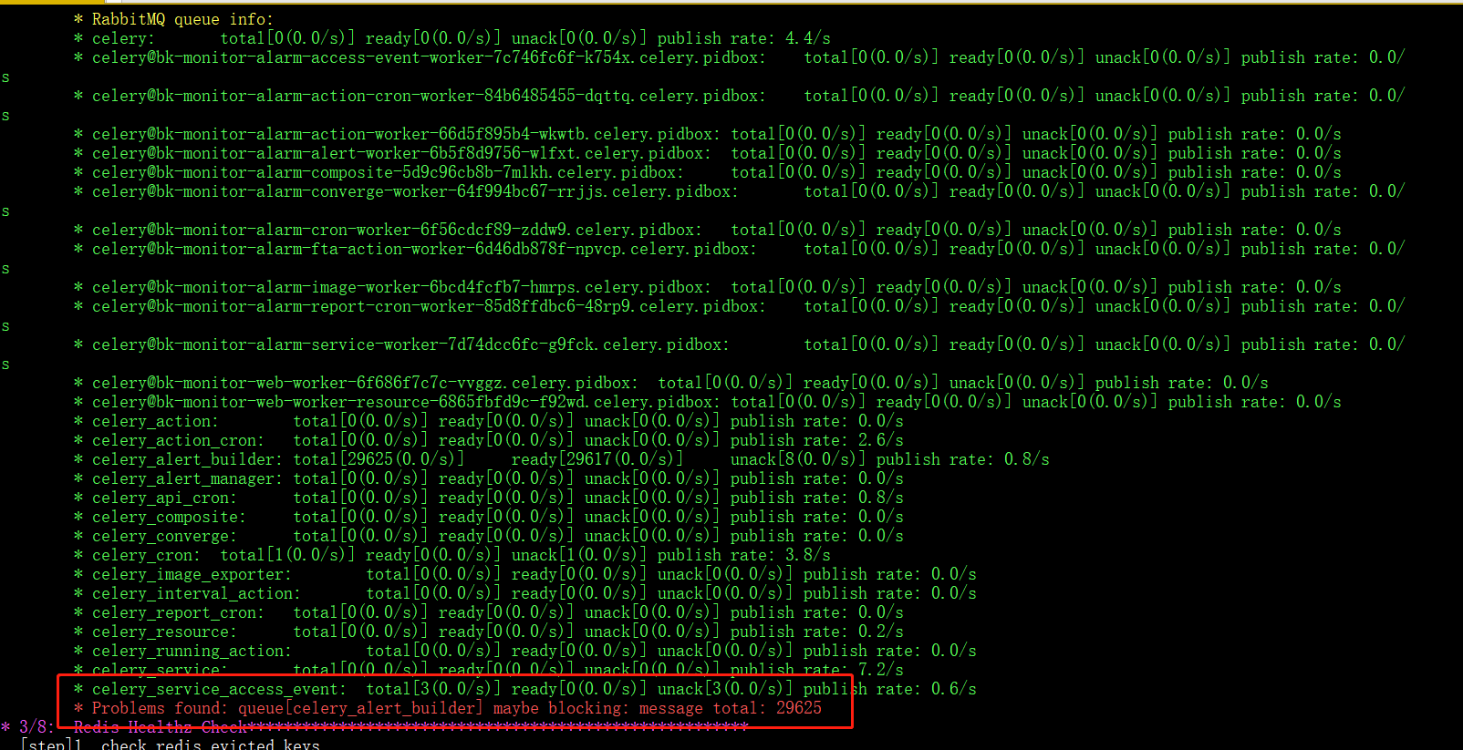 企业微信频繁接收到蓝鲸运维平台消息组件消息队列阻塞的告警,并且消息队列堆积的比较严重,通过企业告警以及蓝鲸平台集群监控都可以得知阻塞的队列是: celery_alert_builder