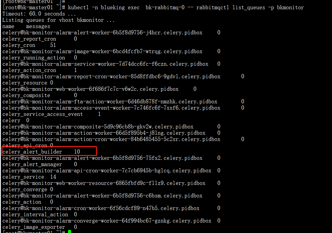 kubectl -n blueking exec bk-rabbitmq-0 -- rabbitmqctl list_queues -p bkmonitor|grep celery_alert_builder |tee -a /tmp/stdout.txt