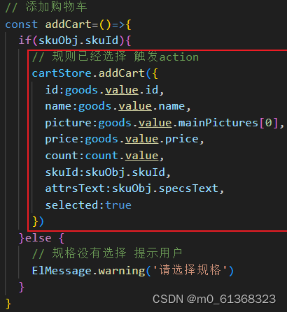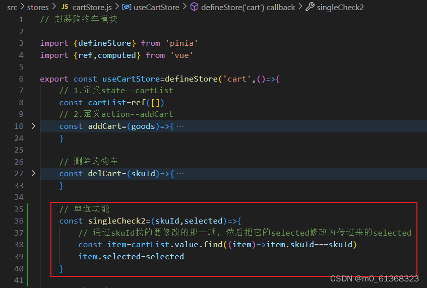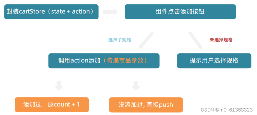 1.购物车业务逻辑梳理拆解1.购物车业务逻辑梳理拆解1. 整个购物车的实现分为俩个大分支,本地购物车操作和接口购物车操作2. 由于购物车数据的特殊性,采取Pinia管理购物车列表数据并添加持久化缓存2.本地购物车 - 加入购物车实现1)封装cartStore在stroes里新建cartStore.js,用于封装购物车模块2)组件点击添加按钮给购物车绑定添加事件定义添加购物车事件3)调用action