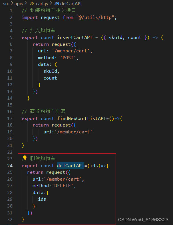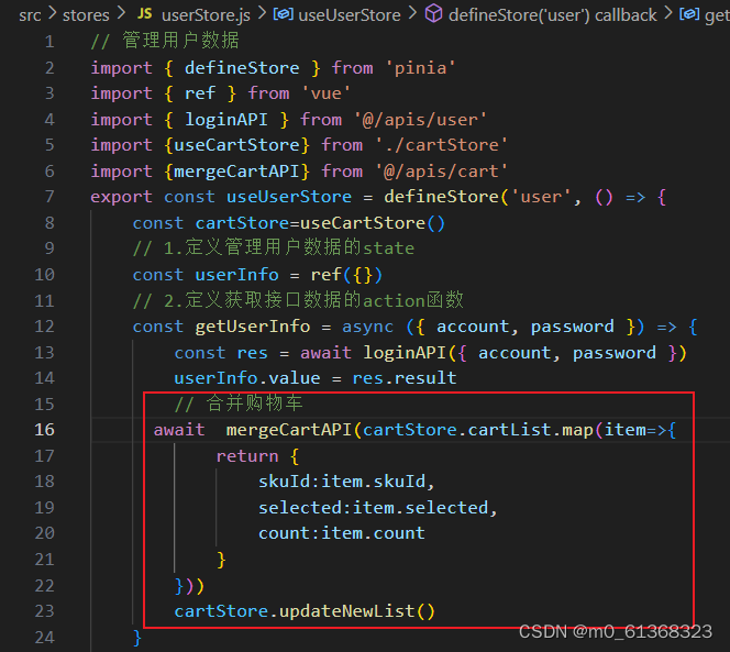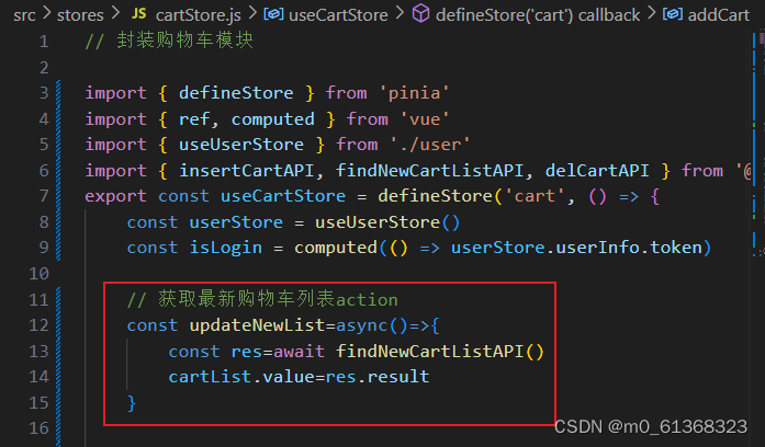 由于会在多个地方获取最新的购物车列表,所以把获取最新购物车列表封装为一个函数,直接调用函数使用。