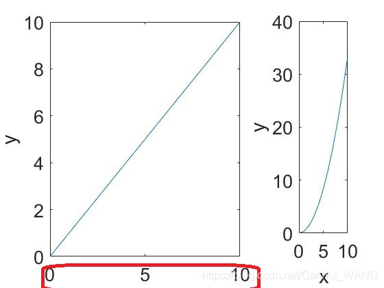 1. 问题描述问题描述: Matlab画图的时候,有时候回出现X轴刻度显示不全的问题。举例: 举例说明上述问题,示例Matlab代码如下,% datax = 0:10;y1 = x;y2 = 1/3.*x.*x;% subplot1subplot(1,3,[1,2]);plot(x,y1)% settings of subplot1xlabel('x');ylabel(...