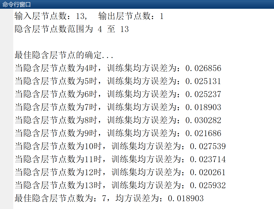(1)根据经验公式,通过输入输出节点数量,求得最佳隐含层节点数量: