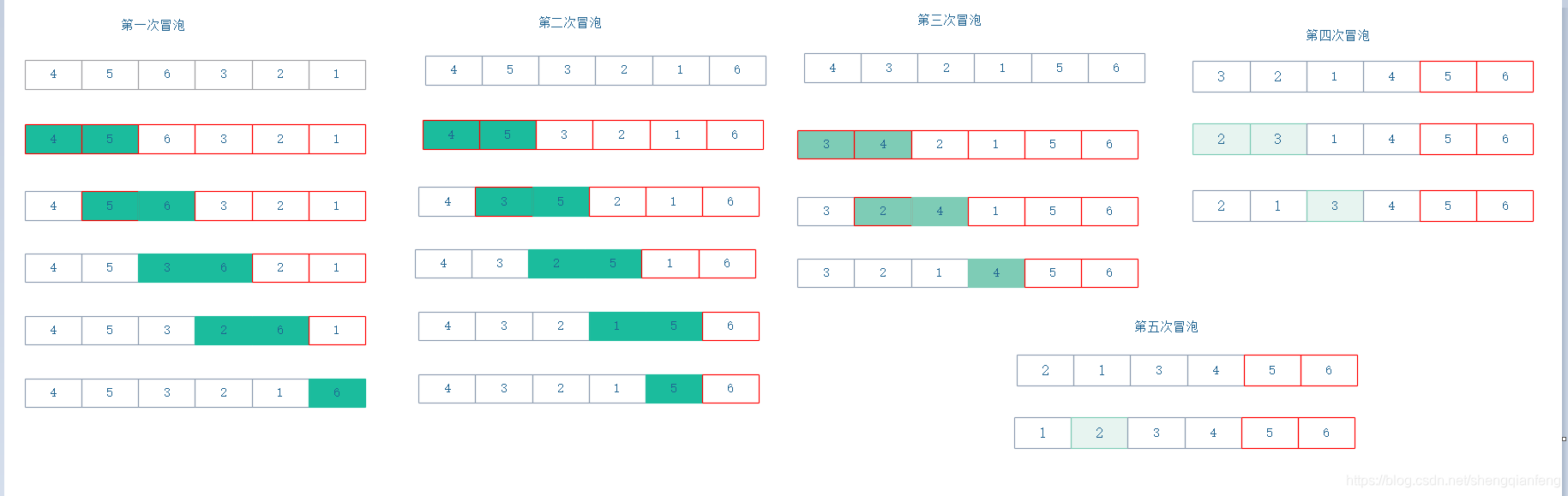 如图所示,对数组[4,5,6,3,2,1]进行冒泡排序。