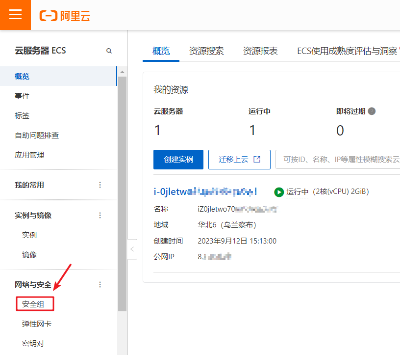 如果之前已经创建过的话,选择实例下的安全组中的管理规则