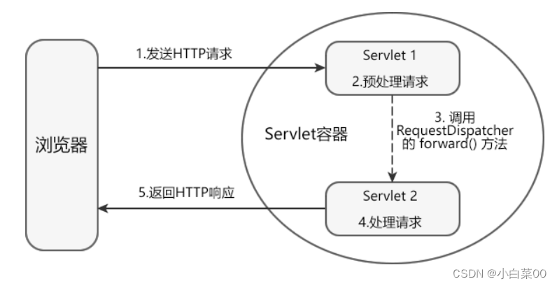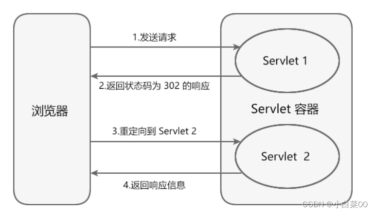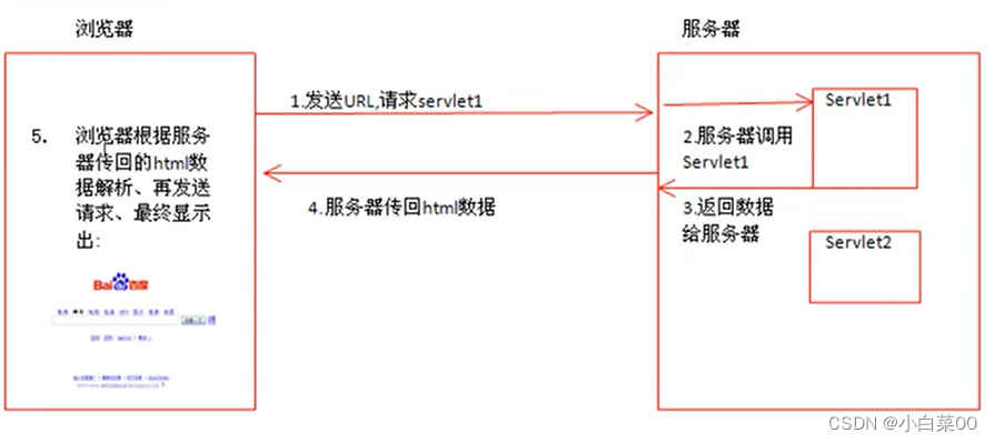 过程:浏览器发起请求到web容器(tomcat),之后web容器产生两个对象(请求,响应)web容器根据请求url地址中的url信息在webapps目录下找到对应的项目文件夹(虚拟项目名),然后再web.xml中检索出对应的servlet,找到后调用并执行servlet的生命周期函数