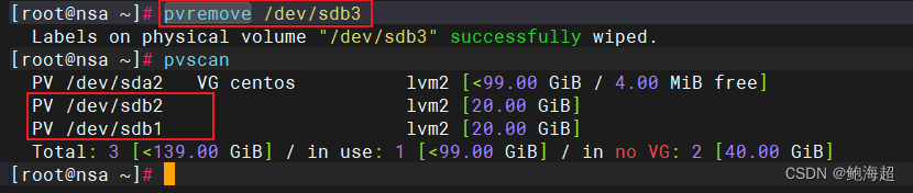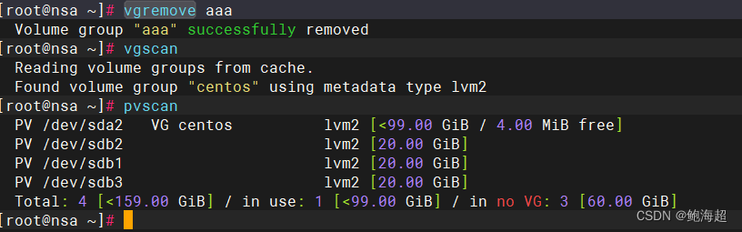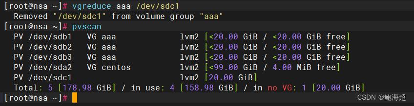vgreduce + 卷组名称 + 要移除前面卷组的物理卷
